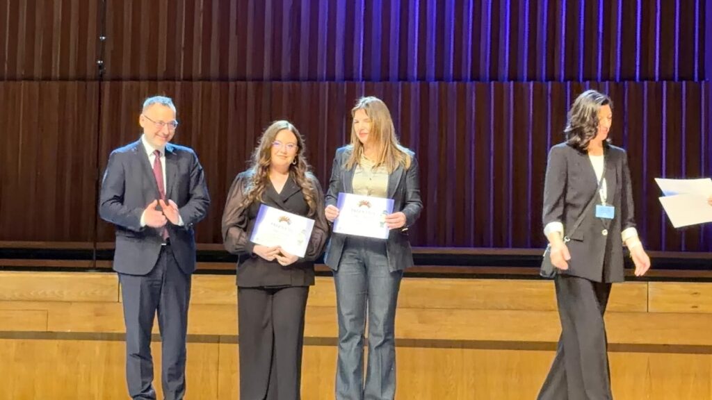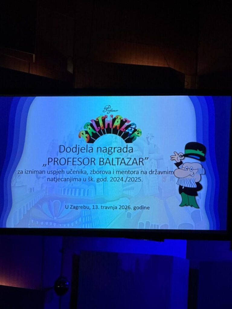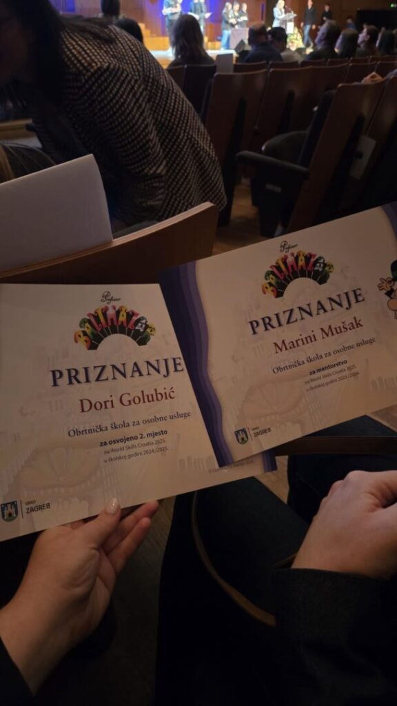 U ponedjeljak 13.4.2026. je u Koncertnoj dvorani Vatroslava Lisinskog dodijeljena nagrada “Professor Balthazar” učenicima i mentorima zagrebački osnovnih i srednjih škola koji su na državnim natjecanjima u znanju, strukovnim vještinama te glazbi i plesu osvojili prvo, drugo ili treće mjesto. Nagradu su gradonačelnik Tomislav Tomašević i pročelnik Gradskog ureda za obrazovanje, sport i mlađe Luka Juroš dodijelili našim učenici Dori Golubić i mentorici Marini Mušak za osvojeno 2. mjesto na Državnom natjecanju WorldSkills Croatia u disciplini Kozmetička njega za šk. God. 2024/2025. Čestitamo Dori i mentorici Marini!